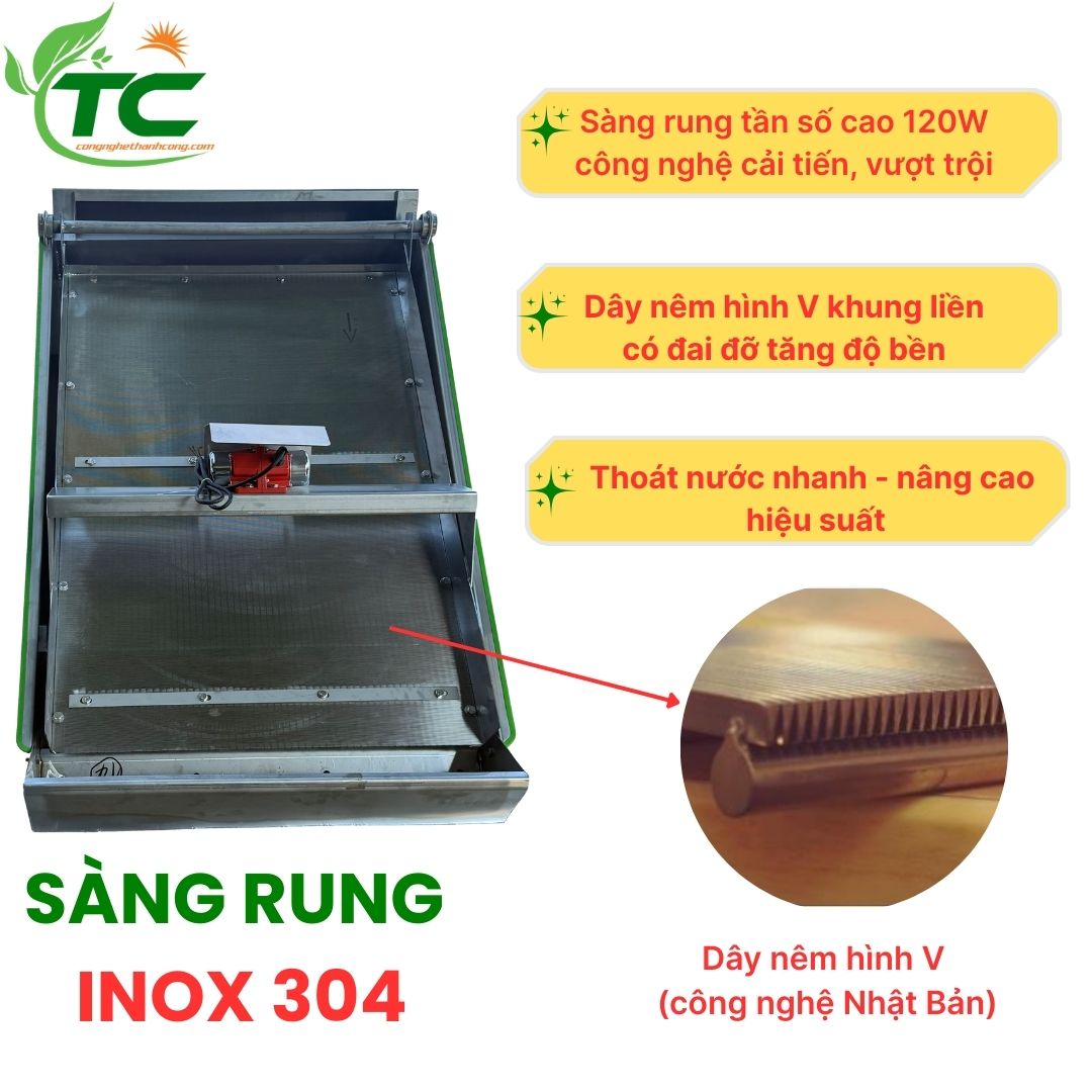 - Sàng trượt co đặc phân : làm từ inox 304, dây nêm hình V khung liền (Công nghệ Nhật Bản), có đai đỡ bắt ốc tăng độ bền. Máy sử dụng thiết kế sàng trượt kết hợp lò xo và bộ rung cao tần 120W, giúp thoát nước nhanh hơn nhiều so với các dòng rung vừa và thấp, đồng thời cô đặc phân hiệu quả hơn.